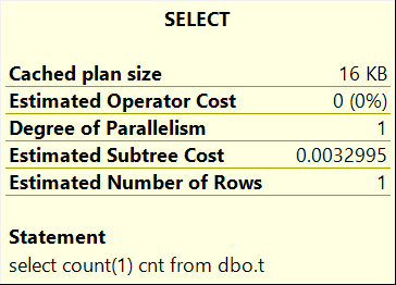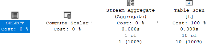The simplest way to execute this query is to scan each row in table [t] and count the rows. SQL Server uses two iterators to achieve this result: one to scan the rows in [t] and another to count them: