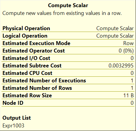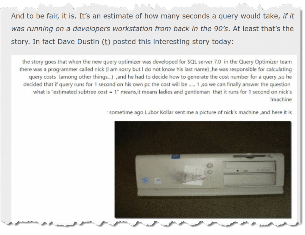 The Execution Plan is read from right to left. In SQL Server 2025 the Operator values are exactly the same. The Operator Costs are based on Nick’s machine (probably a Pentium processor and an spinning hard disk, soft disks were 5.25″ or 3.5″ floppy/cd drives. Query Costs are meaningless now, but still used by the Optimizer to decide which access path is chosen to bring up the data. The modernization of hardware is not taken into account.