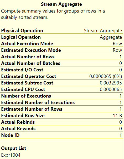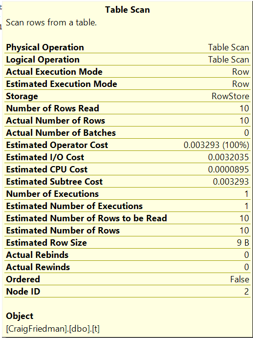 Finally, the scan is implemented using the aptly named table scan iterator while the count(*) operation is actually implemented using the stream aggregate iterator. I’ll delve into more detail about many of the different iterators supported by SQL Server in future posts.
