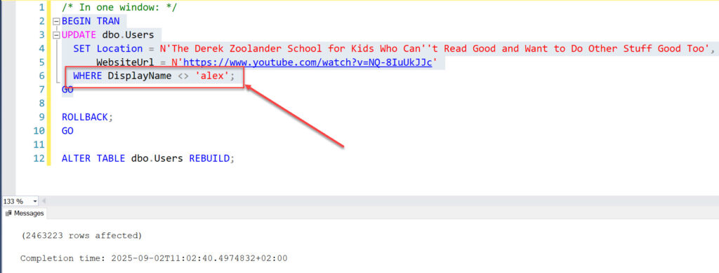 In the StackOverflow2013 database all users with the DisplayName not equal to ‘alex’ are update with a long location. SQL Server has to fit the data on pages and shuffles data around.