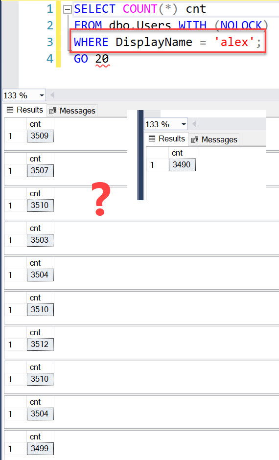 If we do not care about the exact value of the number of records with the DisplayName of ‘alex’ it is 3509 or 3507 or 3503… who cares anyway… but if this a stock values or a financial value .. oeps… use RCSI?