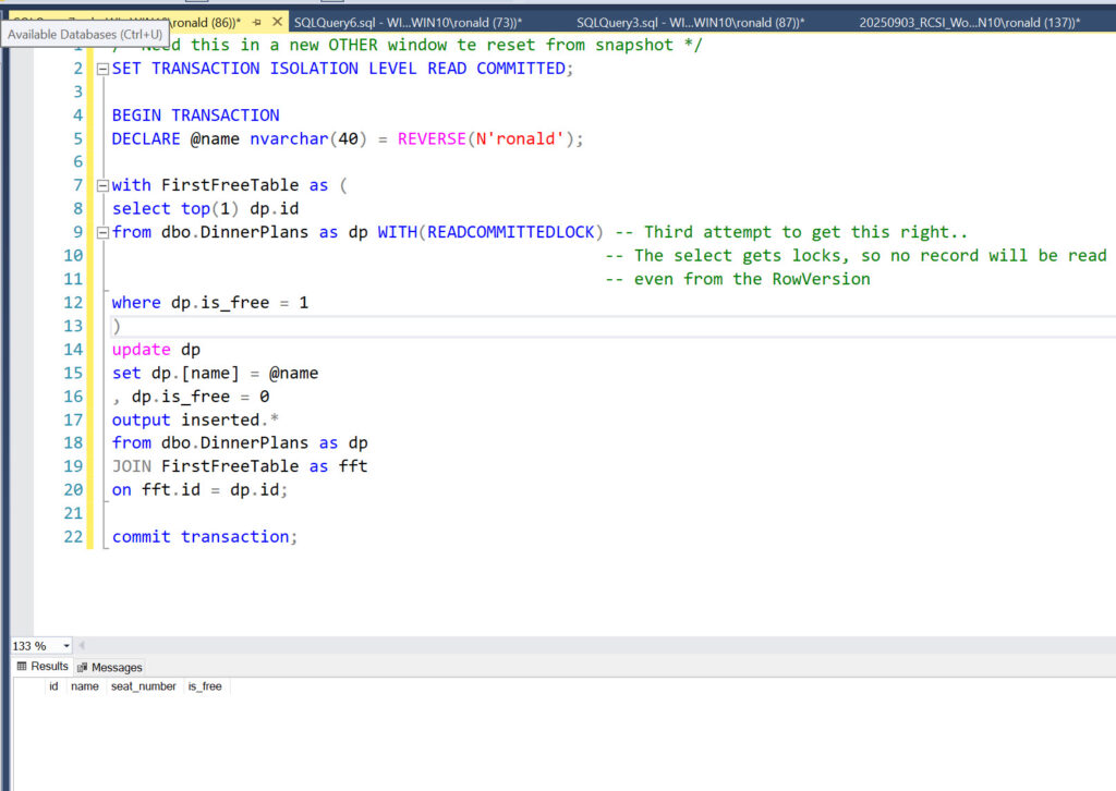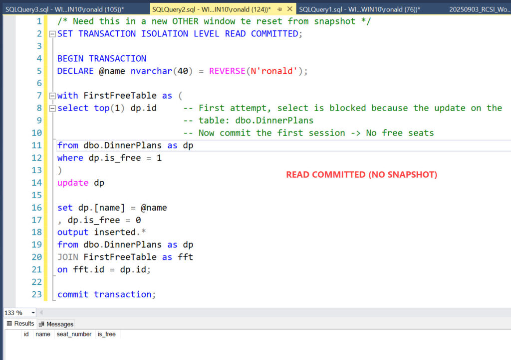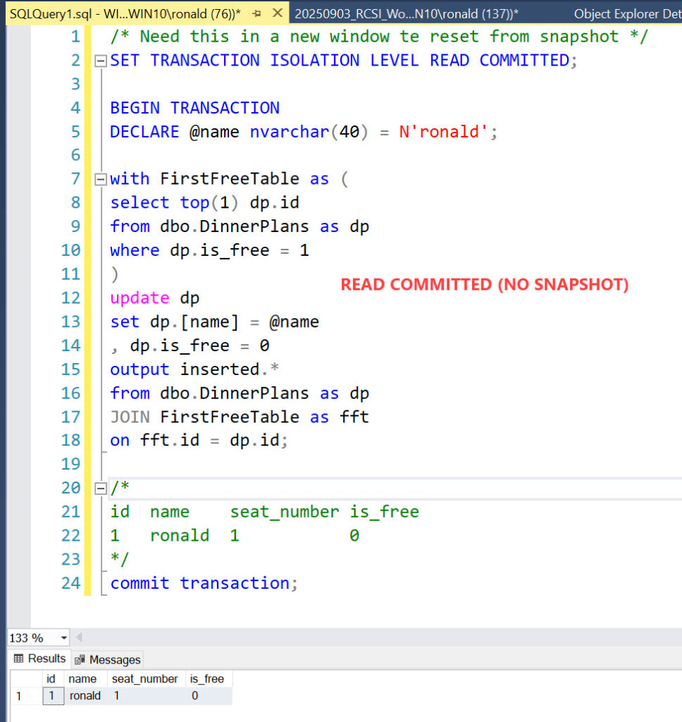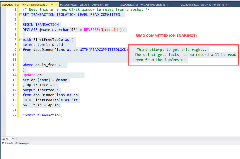 b) Read Committed Snapshot and where is the lock (fine, but is our data still correct?)